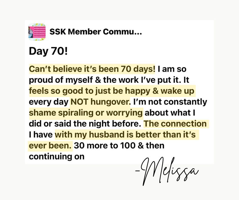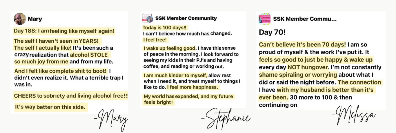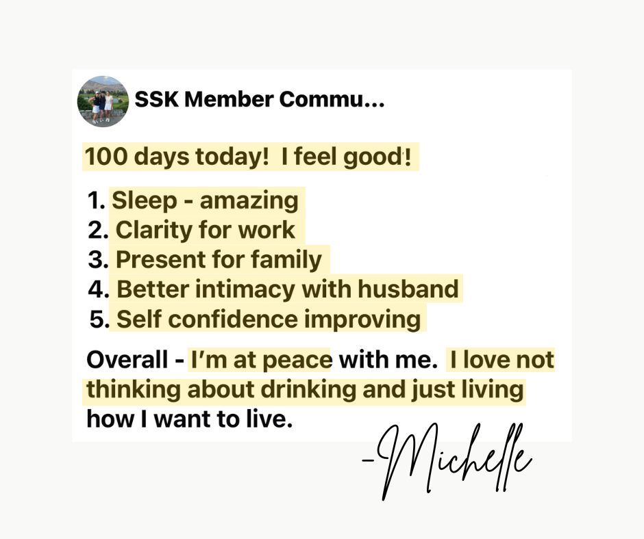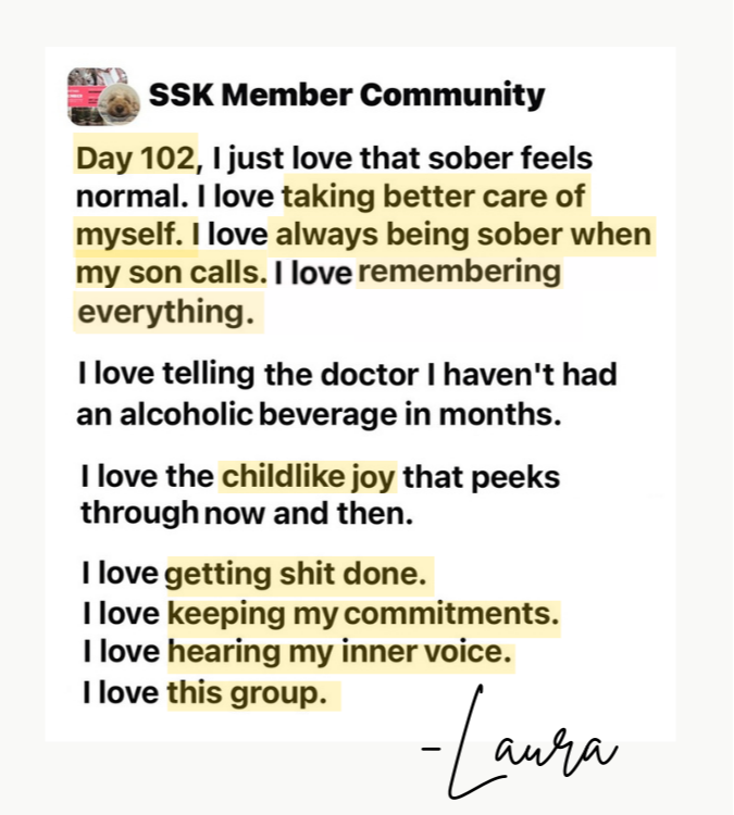 I just hit 100 days alcohol-free and I've never felt better! The Sobriety Starter Kit® was instrumental in helping me hit this milestone. I loved that it was so positive with practical tools to make life without alcohol really great. A lot of the approaches out there seem sad or dark and The Sobriety Starter Kit is the exact opposite of that. It’s happy and sparkly! I'll keep coming back to the course for refreshers and I'm so thankful for you!!!