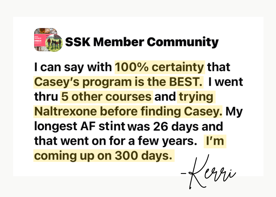 Casey's Sobriety Starter Kit® has made ALL the difference in my sobriety journey. I had been struggling to quit drinking for nearly 2 years, but after listening to Casey and working through the SSK, everything shifted for me. I'm nearly 8 months alcohol-free now, and it feels like my new normal. I'm so grateful! If you're questioning your alcohol use do yourself a favor and get this program!