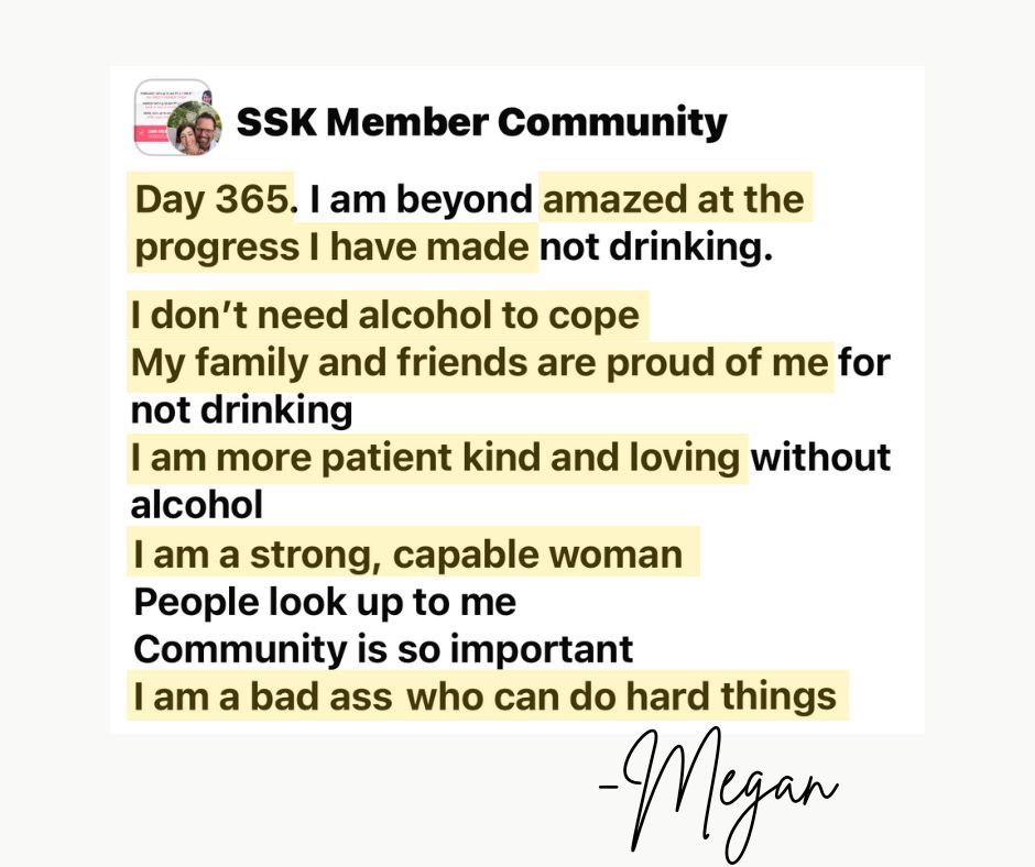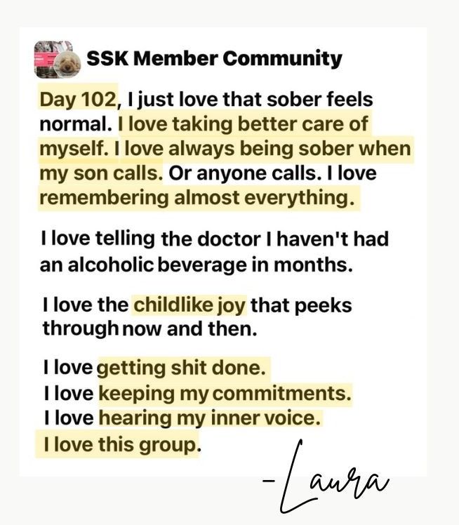 After many years of trying to stop drinking, this time feels different. The tools in the course are amazing! The framework of The Sobriety Starter Kit® makes so much sense. Even my husband, an everyday drinker for the last 30 years, listens when he’s in ear shot. He’s on Day 5 today!
