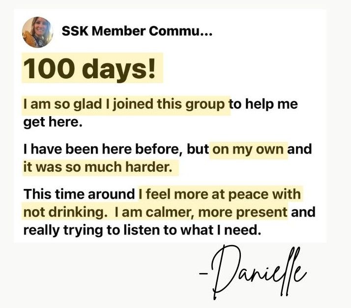 Today is 100 Days Alcohol-Free!!! It feels kind of surreal, and honestly - it feels like it’s been too easy! However I put that down to the kick ass Sobriety Starter Kit® program. It gave me perspective, mindset, tools, vision, support and accountability to get me on my way and set me free. Thank you!