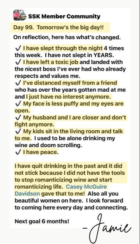 I started the Sobriety Starter Kit® course on my (one-millionth or so) Day 1 and am on Day 100 today! I can’t remember the last time I went six days without drinking, much less 14 weeks. For years the idea of not drinking ever again has been looming over me as the biggest, hardest, most impossible thing. Casey’s course breaks down that big undoable thing into manageable chunks. I loved having Casey’s voice guiding me and encouraging me every day. I do not have the words to adequately convey how much this course has changed my life.