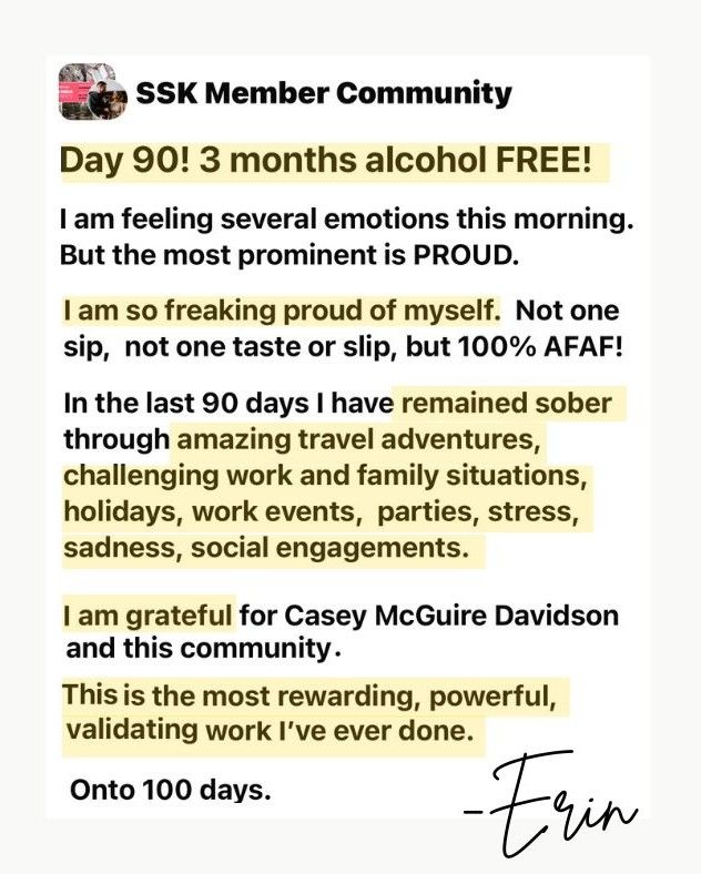 Casey!!! I just hit Day 134 alcohol-free and it’s the longest sobriety streak in my life! I’m doing great and it is because of The Sobriety Starter Kit®. Even when things happen that leave me feeling sad, disappointed and angry, I dig into the pre-lapse lessons in the course instead of drinking. So many of the lessons in The Sobriety Starter Kit® help me navigate hard times without numbing out. I’m using all the tools you taught me to get through my first 30 days without alcohol. I don’t want another day one and know that I’m a BADASS for not drinking, even when life isn't perfect. Thank you for the amazing lessons in The Sobriety Starter Kit®!