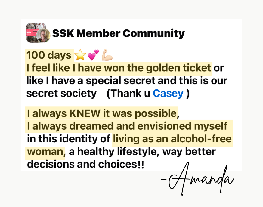 Today is Day 100! I started the Sobriety Starter Kit® and completed it start to finish. You have created the most incredible tool for women who want to stop drinking! I love the focus on habit change and celebrating your wins. My birthday was last week and I woke up feeling so proud of what I've done and where I'm going. I love how my skin looks. I'm finally losing the weight I gained from drinking. And it was a relief to wake up without the burden of knowing that booze was something I still needed to tackle. Most of all I'm so happy that my 3 year old now has a Mama who puts her health first and models mental, physical and spiritual health. Casey, I want to thank you from the deepest part of my soul for being the voice and providing the tools that helped me finally say "Fuck this. I want better!"
