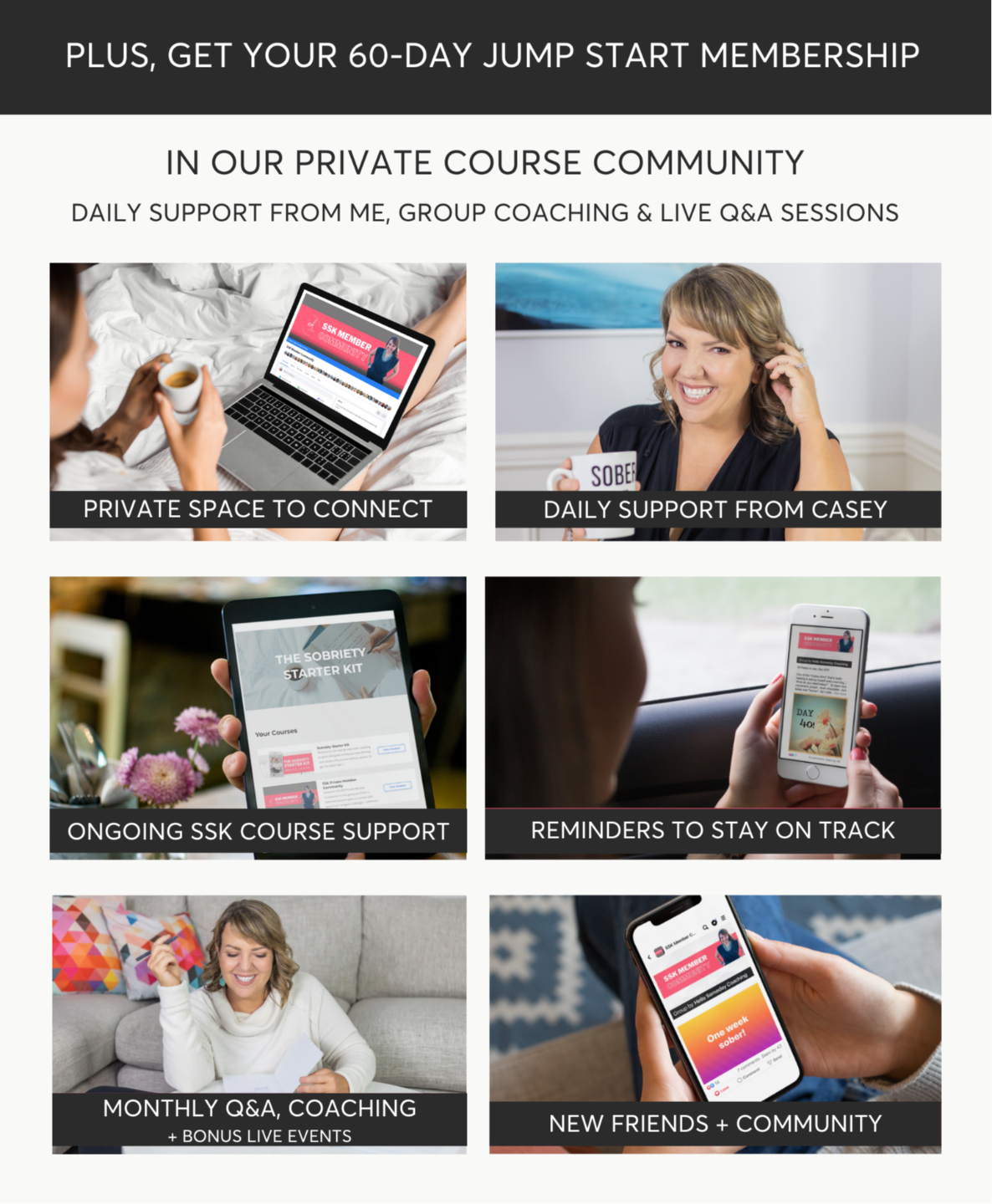 ✨ 8 step-by-step sober coaching modules with over 70 video lessons to take you from Day 1 to one year alcohol-free + beyond